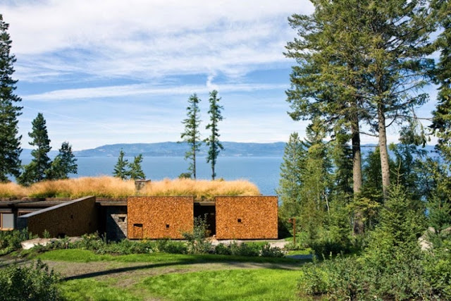 “This remote Montana Camp is situated along a sloping hill, leading visitors to discover the site progressively. From the gatehouses, a path leads down the hill to the master house, main lodge, and guesthouse. The buildings offer warm, almost cave-like spaces as well as expansive porches, open to the views and sunlight. Small windows and thick walls facing into the slope of the site are contrasted with entire walls that open up towards the lake.